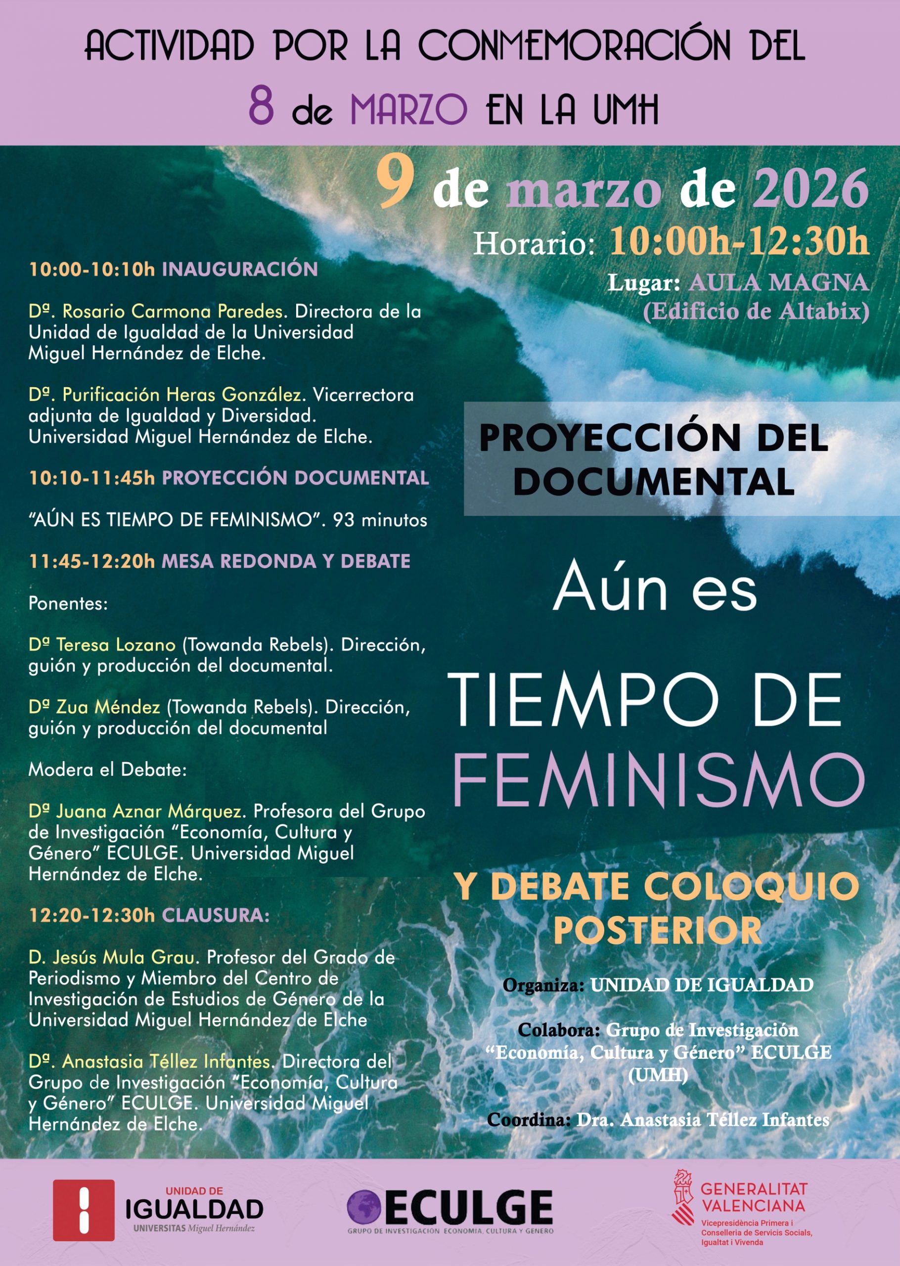 La Universidad Miguel Hernández (UMH) se suma una vez más a las celebraciones por el Día Internacional de la Mujer con una jornada dedicada a la reflexión y el análisis feminista. El próximo lunes 9 de marzo de 2026, el Aula Magna del edificio Altabix (campus de Elche) acogerá el evento «Aún es tiempo de feminismo», organizado por la Unidad de Igualdad de la institución. El acto es de entrada libre limitado al aforo.